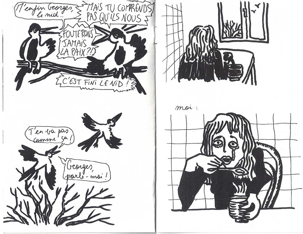 Une petite B.D sur une histoire d'oiseaux observée par la fenètre de la cuisine.